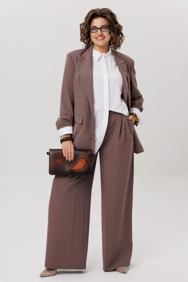 Такой костюм от Анелли можно носить как вместе, создавая цельный образ, так и по отдельности, комбинируя жакет или брюки с другими элементами гардероба. Это делает его универсальным и практичным решением для различных ситуаций.