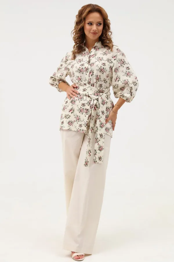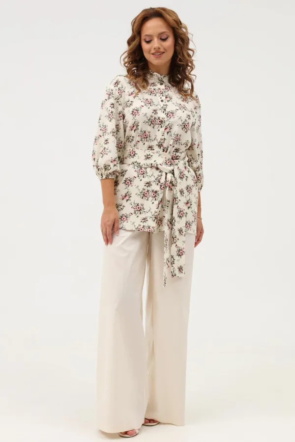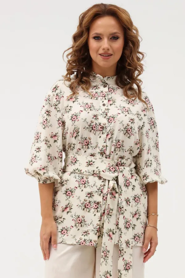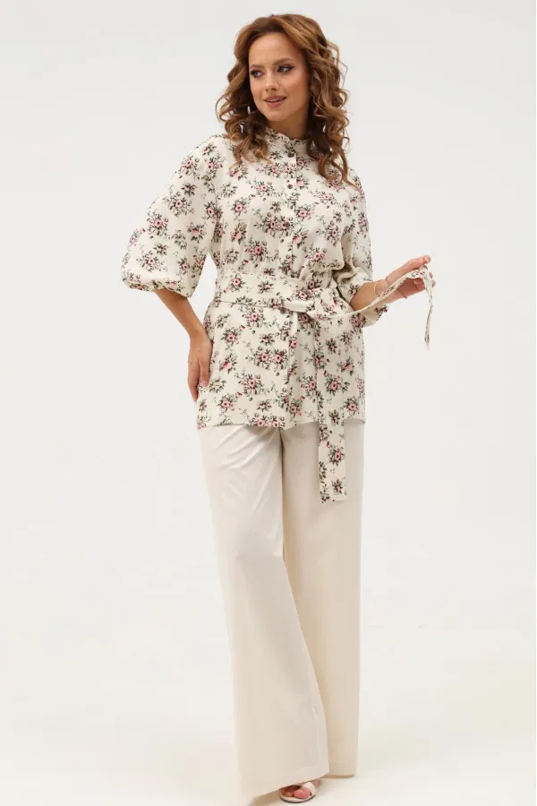 Блузка свободного силуэта. Воротник-стойка. По переду расположена центральная застежка на петли и пуговицы. Спинка с кокеткой. Рукав втачной короткий, со сборкой по низу. Для подчеркивания талии в комплекте идет съемный пояс из основной ткани.