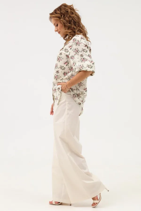 Летний женский комплект-двойка состоит из легкой удлиненной блузки и широких брюк-палаццо. Комплект изготовлен из хлопковых тканей, что позволит телу дышать и прекрасно подойдет для летнего сезона.