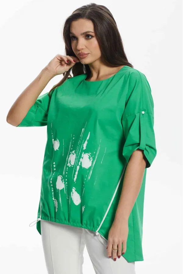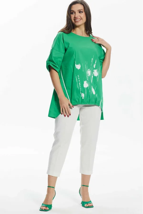 Комплект женский состоит из блузы и брюк. Блуза свободного силуэта со спущенными плечами, с разноуровневым низом. По переду декоративная печать. Полочка переда стягивается и фиксируется. По спинке центральный шов. Горлов... Читать далее...