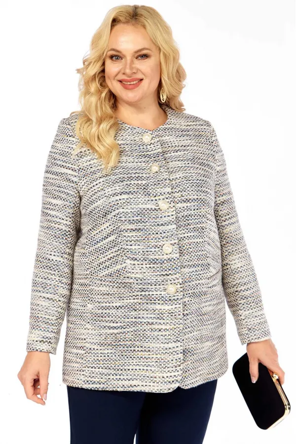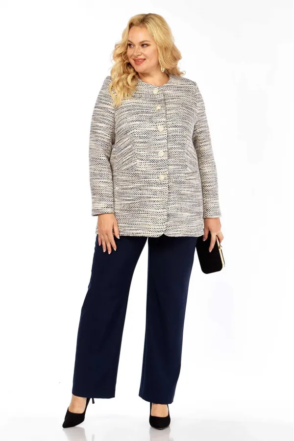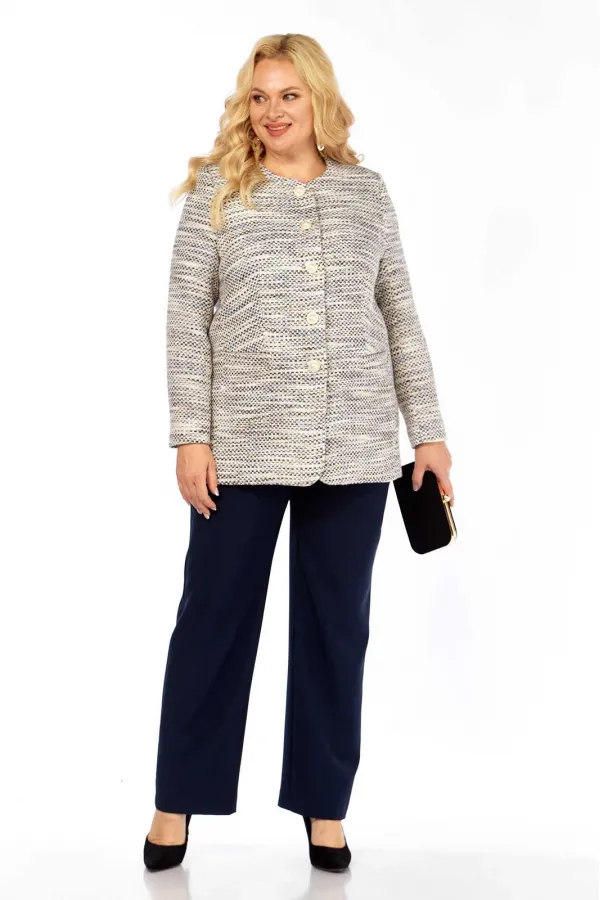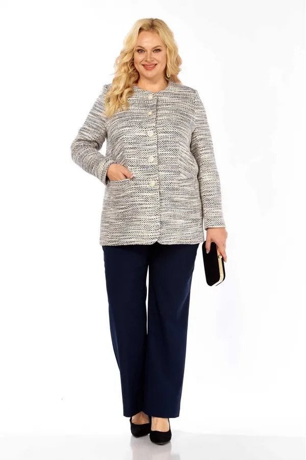 Костюм брючный (двойка) женский полуприлегающего силуэта, состоит из жакета и брюк. Жакет из ткани рогожка на подкладке, без воротника с центральной застежкой на петли-пуговицы. Перед с талиевыми вытачками, карманами. Сп... Читать далее...