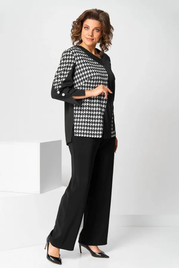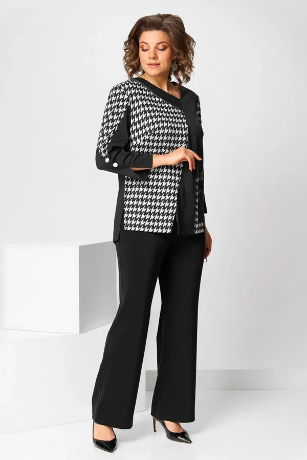 Костюм брючный (двойка) женский полуприлегающего силуэта, состоит из джемпера и брюк. Костюм выполнен и трикотажного полотна и брючной ткани. Джемпер без застежки, рукав длинный с фигурной вставкой. По низу разрез. Горловина фигурная V-образная со вставкой, декорированной тесьмой с имитацией молнии. Перед с асимметричным подрезом в области бедра вставка с карманом с отделочной тесьмой. По переду внизу разрез по рельефу. По боковым швам внизу разрезы. Спинка свободная. Брюки классические, со стрелками на поясе с резинкой. Застежка на гульфик, на тесьму-молнию. Вверху косые карманы.