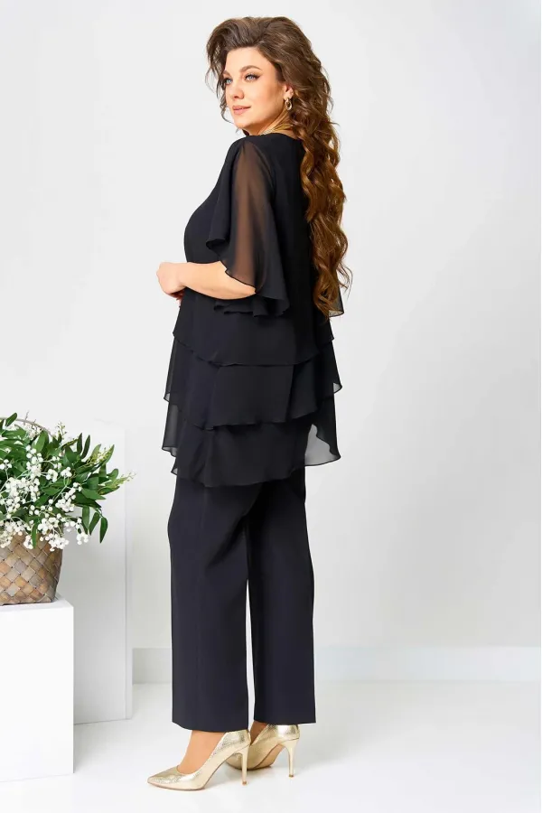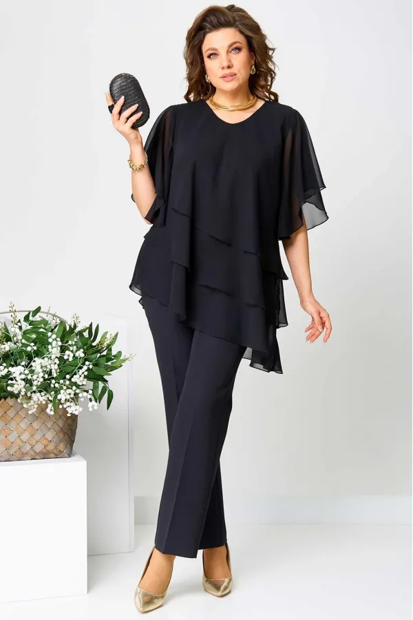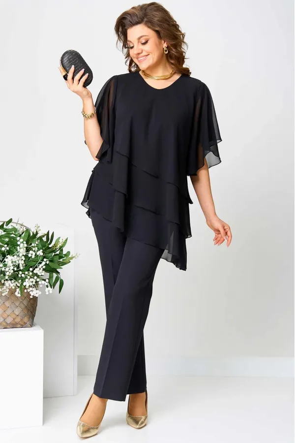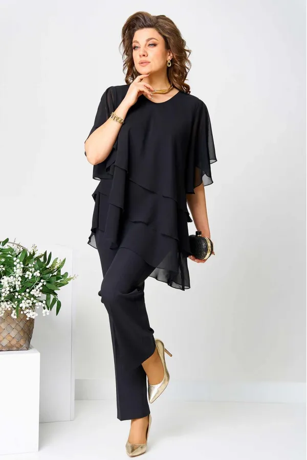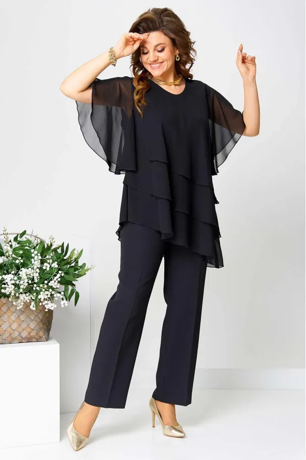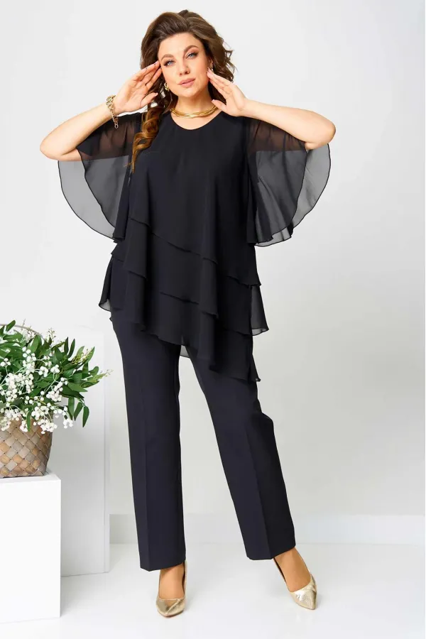 Костюм брючный (двойка) женский свободного силуэта, состоит из блузки и брюк. Блузка с рукавом 3/4 с разрезом и фигурным низом. Изделие (блузка) трехслойное, все слои с асимметричным низом. Застежка-капелька на спинке. Б... Читать далее...