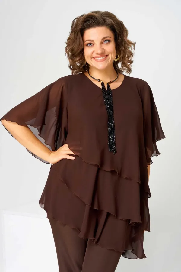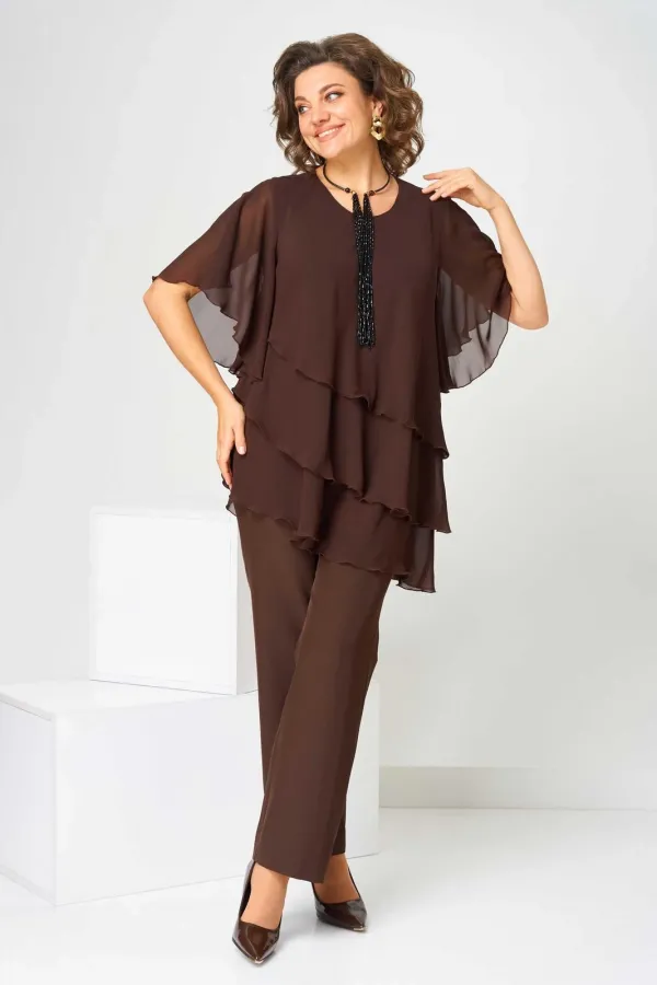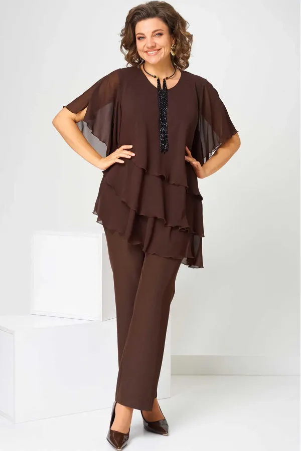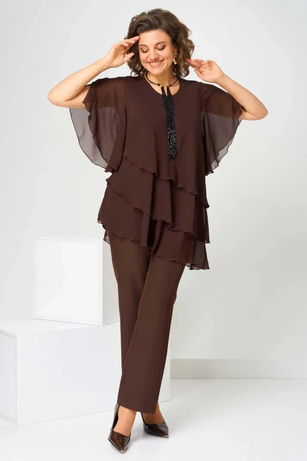 Костюм брючный (двойка) женский свободного силуэта, состоит из блузки и брюк. Блузка с рукавом 3/4 с разрезом и фигурным низом. Изделие (блузка) трехслойное, все слои с асимметричным низом. Застежка-капелька на спинке. Брюки немного расширены к низу, на поясе с резинкой. Застежка на гульфик, на тесьму-молнию.