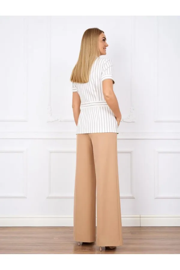 Комплект женский, состоящий из жакета и брюк .Жакет прилегающего силуэта, с коротким рукавом ,отрезной по линии талии ,2-бортный с застежкой на петли и пуговицы ,с отложным воротником с лацканами ,по переду в рельефах -карманы с листочкой , спинка так же с втачным поясом . Изделие без подкладки . Брюки прямые ,свободные ,на поясе-кокетке ,с боковыми карманами, застежкой спереди на молнию и пуговицы.