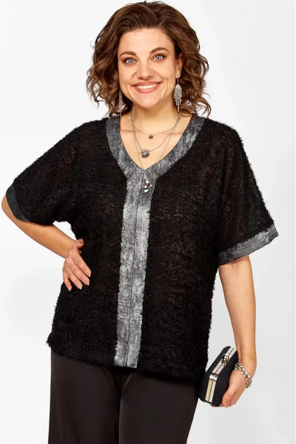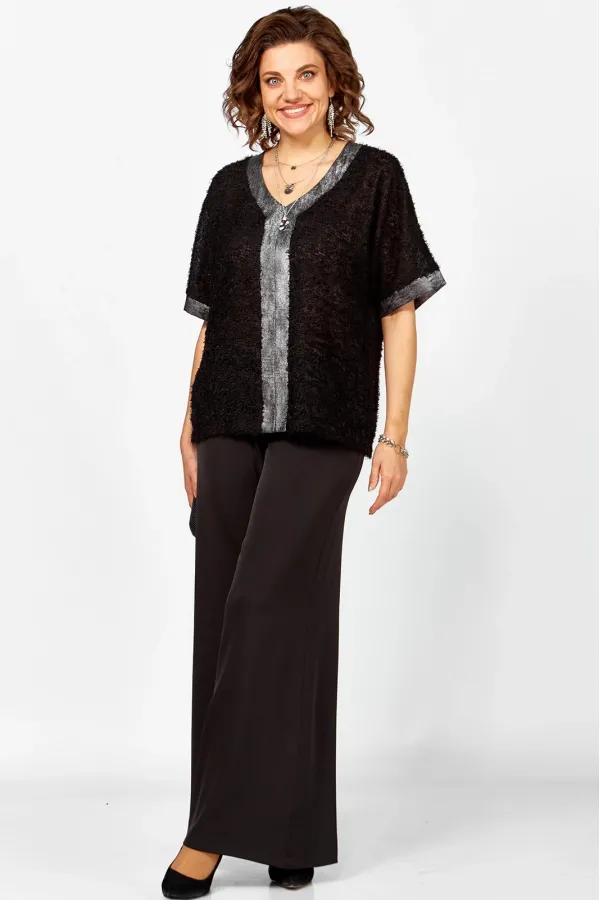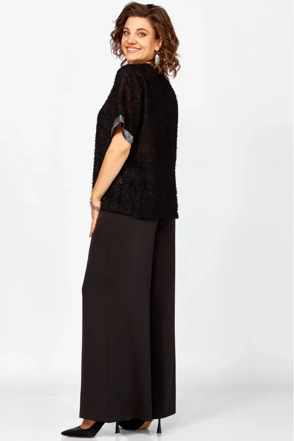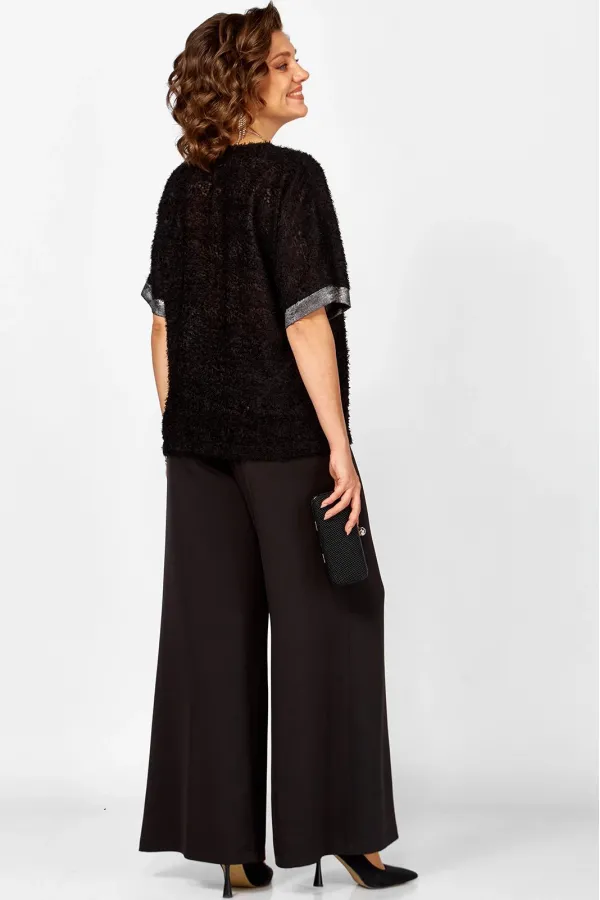 Женский нарядный двухпредметный комплект состоит из блузы,выполненной из двух видов ткани: шифона травка и отделочной ткани,и широких брюк палаццо из струящейся плательно-костюмной черной ткани.