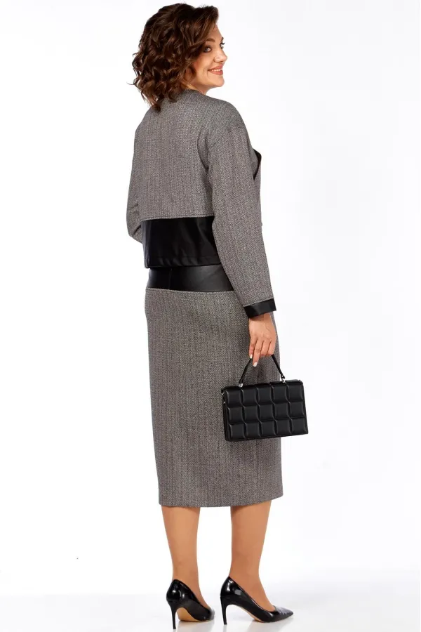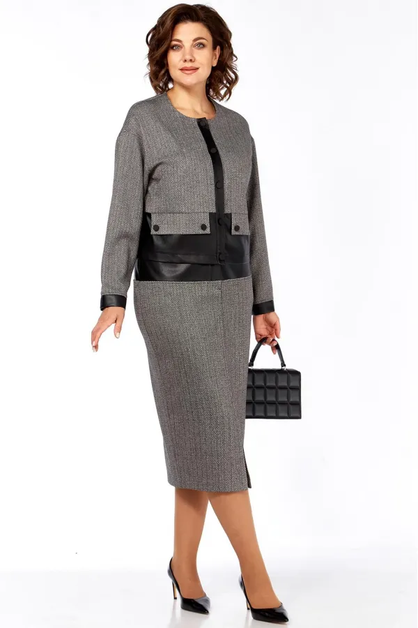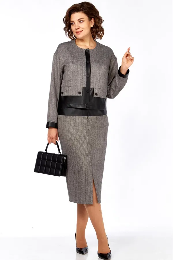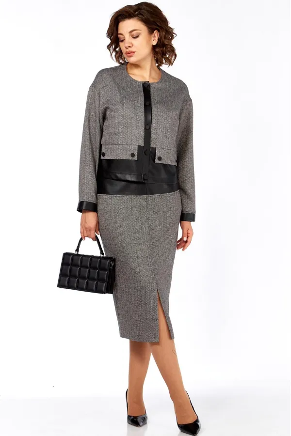 Женский двухпредметный костюм состоит из укороченного жакета и длиной юбки,выполнен из костюмно-плательной ткани в ёлочку с отделкой из эко-кожи.