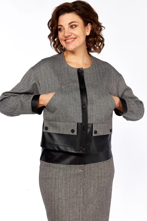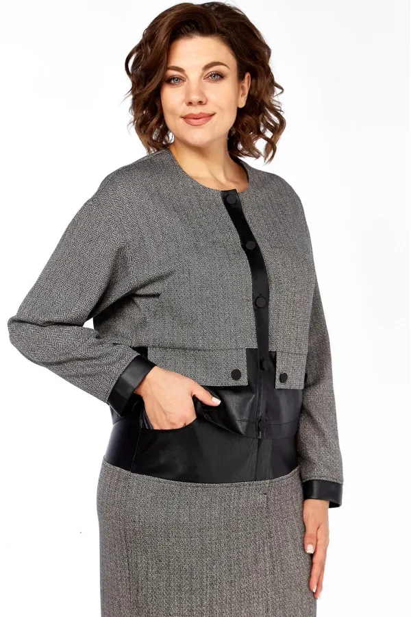 Жакет прямого силуэта,укороченный, с центральной застёжкой на 6 петель и 6 пуговиц и слегка спущенными плечами. Перед с накладными фигурными карманами и цельнокроеными клапанами с декоративными пуговицами. Спинка со средним швом. Нижняя часть жакета,планки и манжеты и выполнены из гладкой черной эко-кожи. Рукава одношовные длинные.