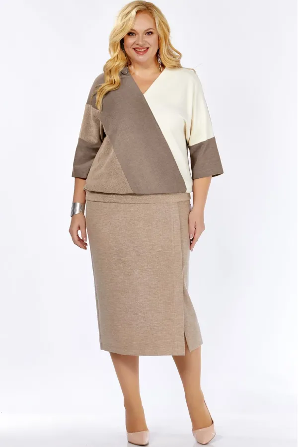 Женский двухпредметный костюм состоит из свободного джемпера и юбки с интригующим разрезом спереди слева.Костюм выполнен из трикотажного полотна в мелкий рубчик ,как вельвет,в 3-х цветах.