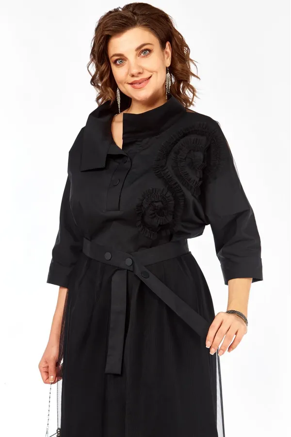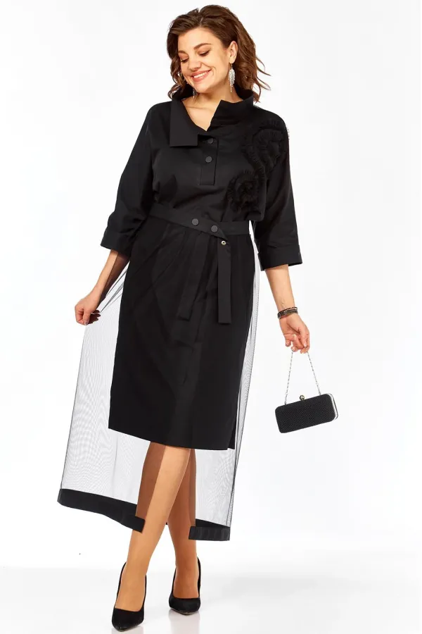 Нарядный женский комплект состоит из свободного платья-рубашки ,выполненного из плательно-костюмной ткани Шуршун и прозрачной юбки назапах, выполненной из сетки.