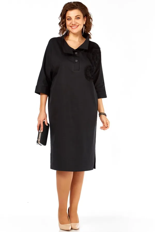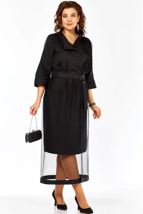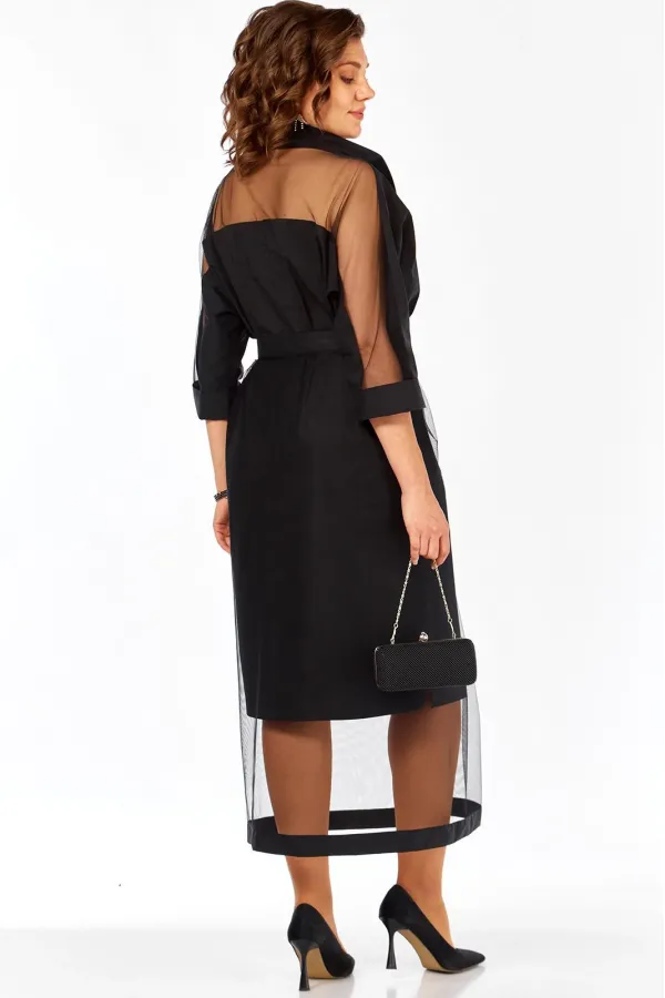 Платье прямого силуэта , оверсайз, с цельнокроеным рукавом длиной 3/4, заканчивающимся притачной отложной манжетой, выполнено из двух видов ткани. Перед с втачными планками по горловине и центральной застёжкой на 2 кнопки, и декоративным элементом из сетки. Воротник - стойка. Спинка с отрезной кокеткой из сетки и средним швом. В боковых швах разрезы.
