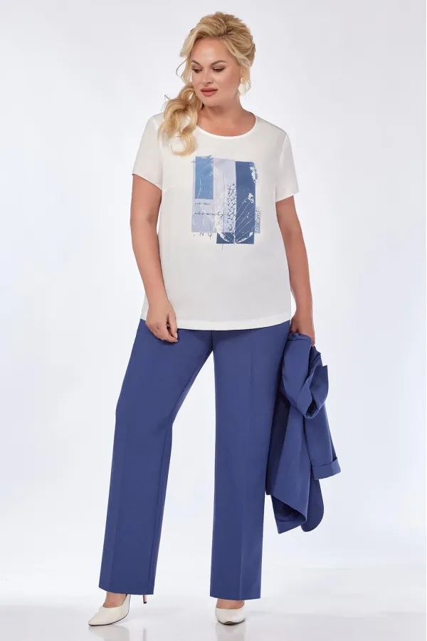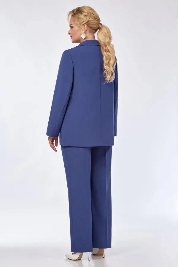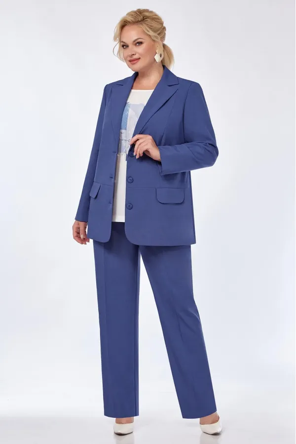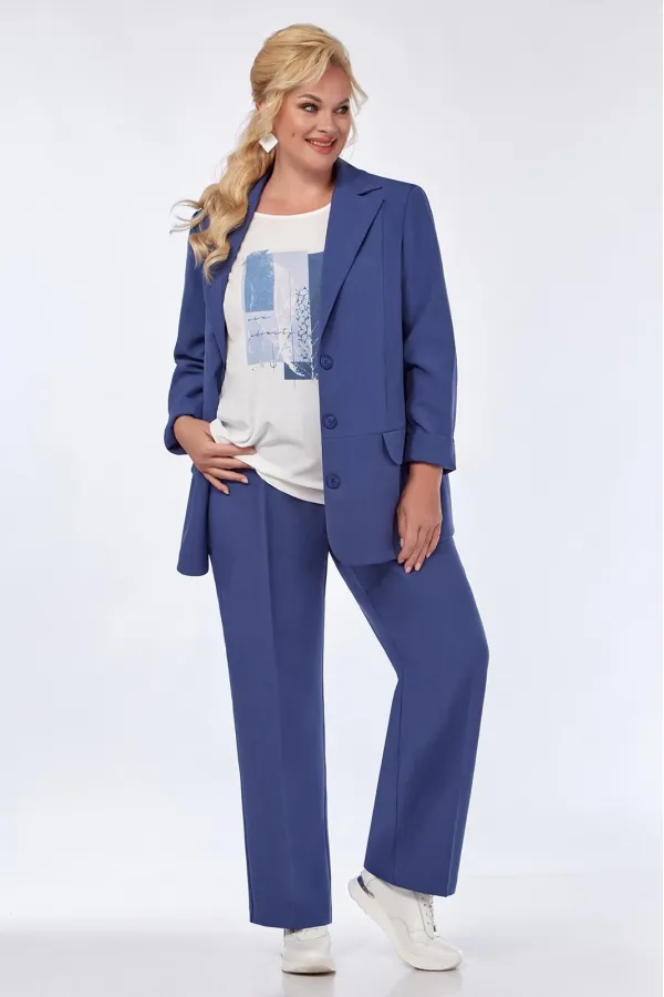 Костюм женский трёхпредметный состоит из жакета и брюк , выполненных из плательно-костюмной ткани и блузы, выполненной из блузочной ткани. Жакет прямого силуэта, с центральной застёжкой на 3 петли и пуговицы и воротником пиджачного типа с отложными лацканами. Перед с рельефами от плечевых швов до горизонтального подреза , расположенного ниже уровня талии, в шве выполнены карманы с клапанами и декоративными пуговицами. Спинка со средним швом. Рукава втачные, двухшовные, длинные ,с высокой подгибкой для возможности отвернуть манжет. Жакет на подкладке. Брюки прямые на притачном поясе с резинкой в области боковых швов и застёжкой на тесьму-молнию и 1 петлю и пуговицу по переду. Брюки со стрелками. Блуза из шёлковой блузочной ткани, с овальным вырезом горловины, со спущенным плечом. По переду обработаны нагрудные вытачки и выполнена декоративная печать.