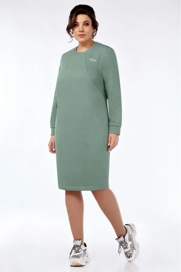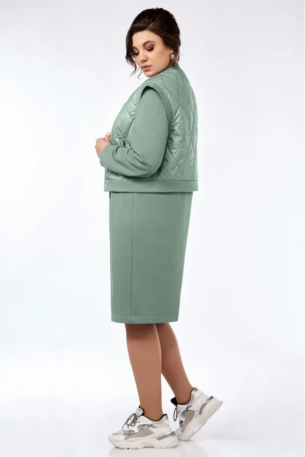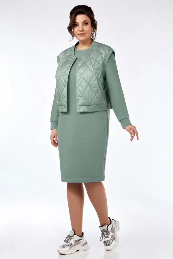 Комплект женский состоит из жилета и платья, выполнен из двух видов ткани. Платье прямого силуэта с длинным втачные рукавом выполнено из трикотажного полотна футер трёхнитка. Перед с отрезными кокетками, на левой выполнена вышивка. Жилет прямого силуэта укороченный, выполнен из плащевой ткани простеганной тонким синтепоном. По переду рельефы от горловины до низа, в швах карманы, вход в карманы обработан листочкой. Застежка центральная на 6 кнопок. Спинка с рельефами. Горловина, проймы, пояс и листочки жилета выполнены из трикотажного полотна футер трёхнитка. Жилет на подкладке в дизайн.
