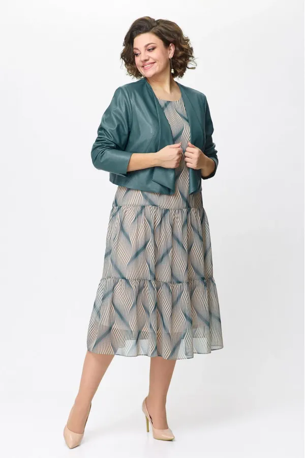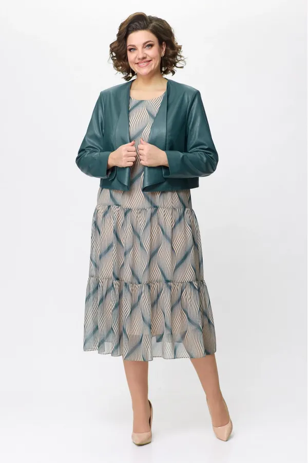 Комплект женский двухпредметный состоит из жакета и платья.Платье с воланами расширенное к низу выполнено из шифона.Перед с нагрудными вытачками.Рукава втачные, одношовные, длиной 3/ 4,со сборкой по окату и сборкой на резинку по низу.Платье на трикотажной подкладке.