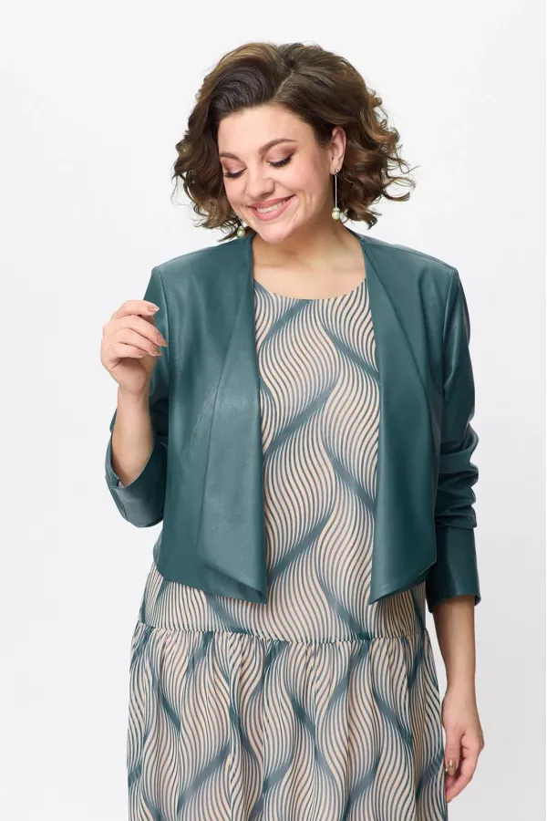 Жакет укороченный прямого силуэта с цельнокроеными отложными лацканами ,без застёжки, выполнен из экокожи.По переду рельефы от горловины до низа.Спинка со средним швом и плечевыми вытачками.Рукава втачные двухшовные,с разрезом по низу локтевого шва .Жакет на подкладке