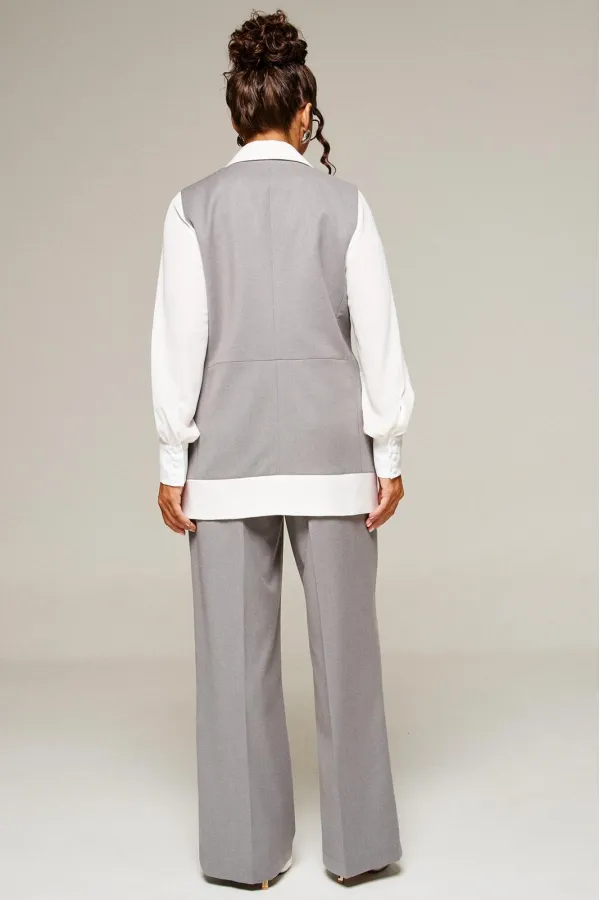 Комплект женский 3-ёх предметный: жилет, брюки, блузка в деловом стиле. Выполнен из костюмно-смесового полотна с нежной, гладко-бархатистой фактурой, приятной на ощупь и матовой поверхностью в контрастном сочетании актуальных оттенков.