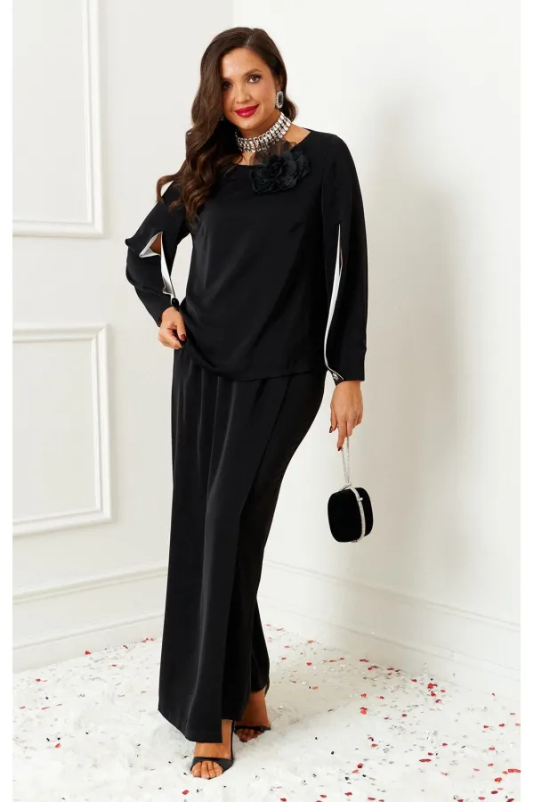 Изысканный нарядный костюм состоит из 2-ух предметов: блузки и брюк. Выполнен из костюмно-смесового полотна. У этой ткани нежная, гладко-бархатистая фактура, приятная на ощупь и матовая поверхность. Она легко драпируется и очень выгодно и дорого подчёркивает силуэт.