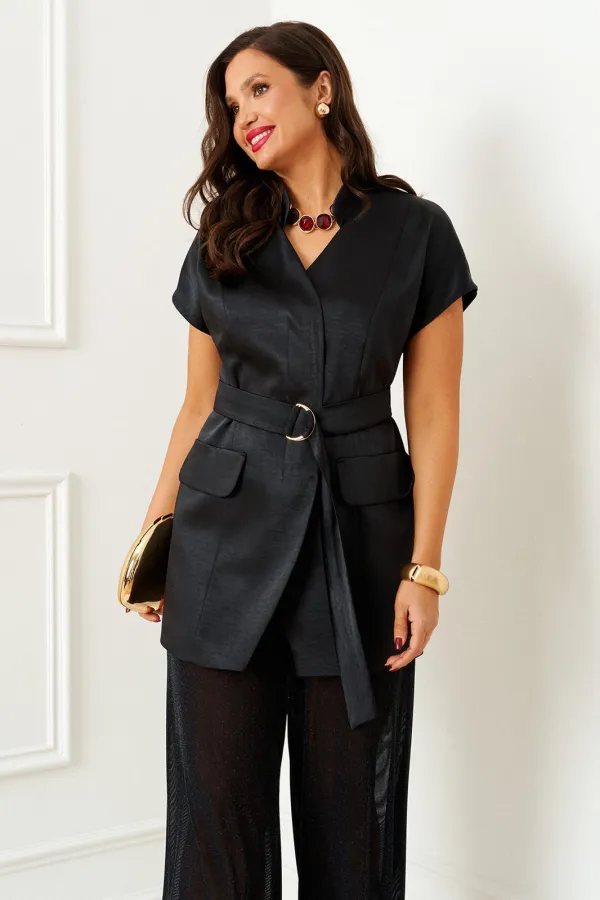 Модель дополнена длинным поясом-завязкой с декоративной пряжкой.