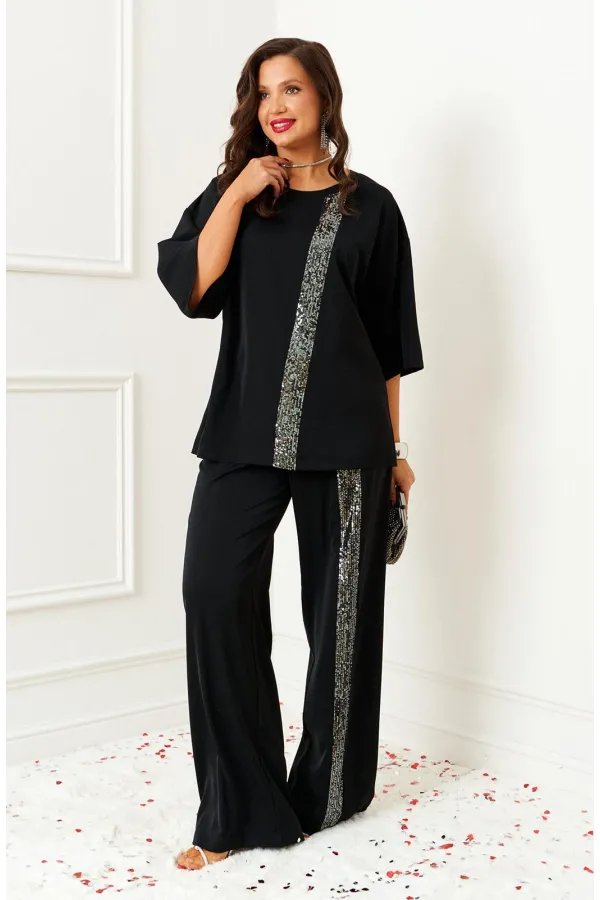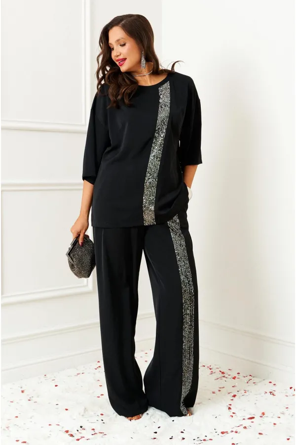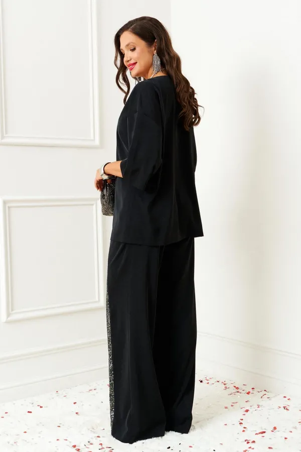 Изысканный костюм состоит из 2-ух предметов: блузки и брюк. Выполнен из костюмно-смесового полотна. У этой ткани нежная, гладко-бархатистая фактура, приятная на ощупь и матовая поверхность. Она легко драпируется и очень выгодно и дорого подчёркивает образ.