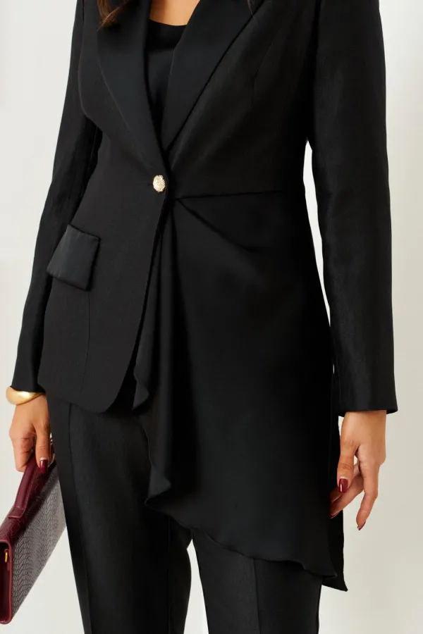 Жакет асимметричного кроя с акцентными фантазийными деталями, на подкладке.