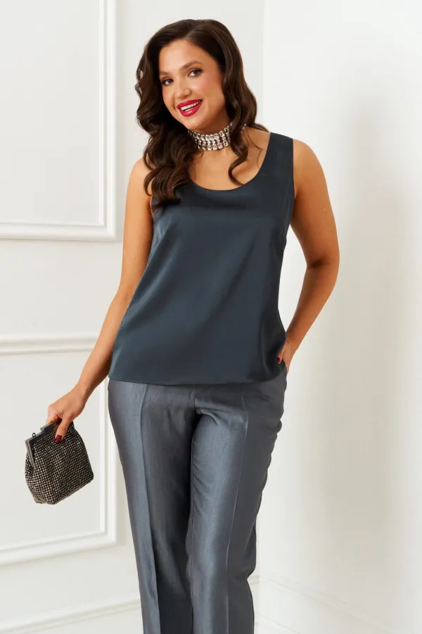 Комплект женский 3-ёх предметный: жакет, брюки, топ. Жакет и брюки выполнены из ткани актуального стильного дизайна. Топ выполнен из атласной ткани с элегантным блеском.