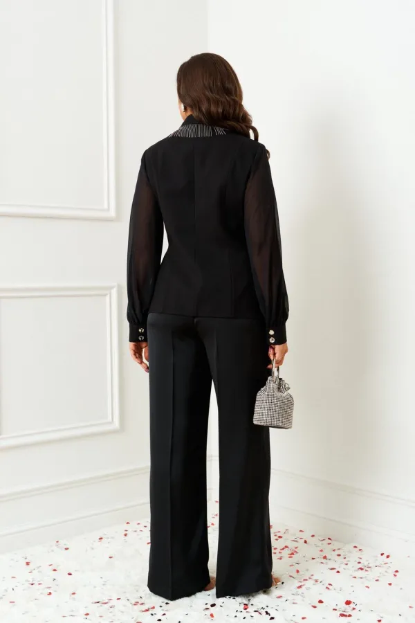 Симфония роскоши и фактур! Сочетание приталенного жакета и широких брюк создает гармоничный силуэт, подчеркивая достоинства фигуры.