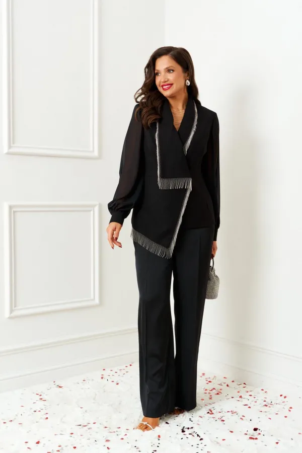 Костюм женский 2-ух предметный: жакет и брюки в деловом стиле. Выполнен в комбинации изысканных костюмного, атласного и шифонового полотен, а также декорирован эксклюзивной цепочной тесьмой.