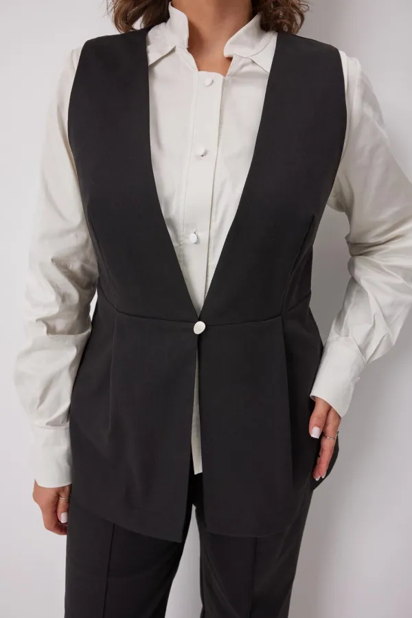 Жилет приталенного силуэта, без подкладки с застёжкой на металлическую пуговицу. Посадка по фигуре идеальна благодаря выверенным лекалам. Акцент на талии создают односторонние складки по линии переда.