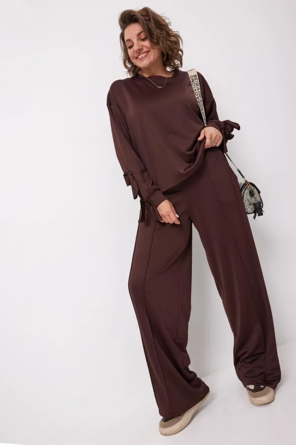 Невероятно уютный, универсальный трикотажный комплект, состоящий из свитшота и брюк свободного кроя. Вы непременно окажетесь в центре внимания, благодаря современному крою и оригинальной расцветке этой модели. Комплект подарит чувство уюта и комфорта. Декоративная отделка пришивными бантами из основного материала с необработанным срезом добавляет шарм его обладательнице.