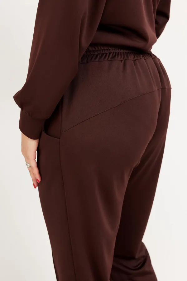 Брюки полуприлегающего силуэта, с застроченной стрелкой по линии переда. Пояс на резинке с островком для Вашего удобства. В боковых швах карманы «Хулиганы». Низ обработан классическим способом вподгибку.