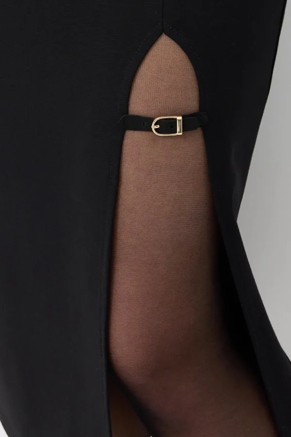 Юбка прямого кроя, пояс притачной на резинке, низ изделия обработан подгибкой. Разрез декорирован пришивной функционально- декоративной пряжкой.