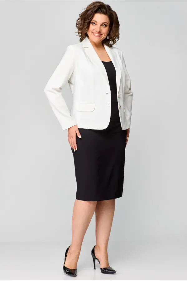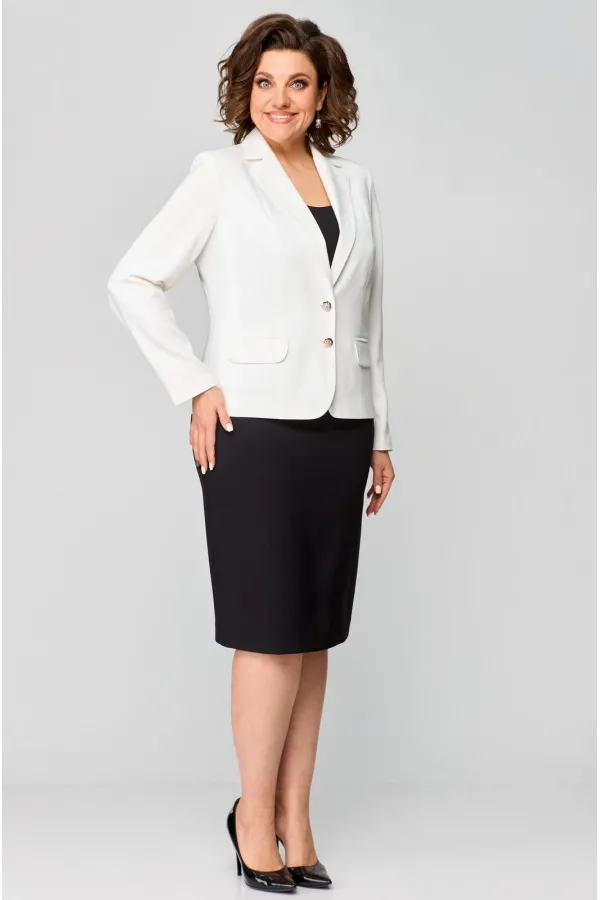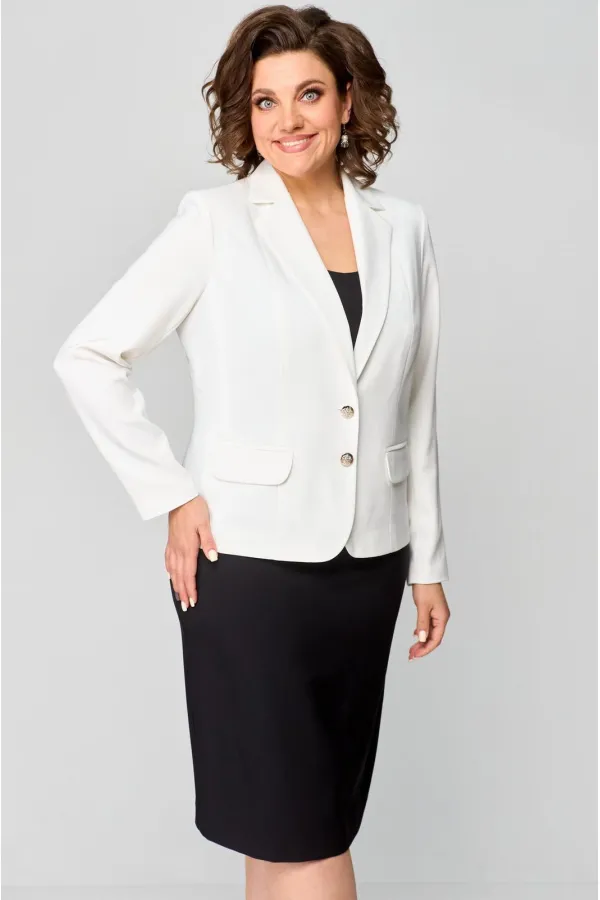 Комплект женский, 2-х предметный, из текстильной ткани, состоит из жакета и юбки. Жакет женский укороченный, на подкладке, полуприлегающего силуэта с центральной бортовой застежкой на пуговицы до линии перегиба лацкана. Спереди рельефные швы от плечевого шва, отрезной бочок и карман с клапаном. Спинка с рельефами от плечевого шва. Рукав втачной, двухшовный, по низу рукава обработана шлица на петли-пуговицы. Воротник пиджачного типа. Длина по спинке 57 см, длина рукава 62 см. Юбка прямого силуэта, из текстильной ткани, верхний срез юбки обработан обтачкой, заднее полотнище со средним швом, застегивается на потайную молнию. Шов переходит к низу в шлицу. По переднему и заднему полотнищах обработаны таливые вытачки. Длина по боковому шву 66 см. Юбка на подкладке.