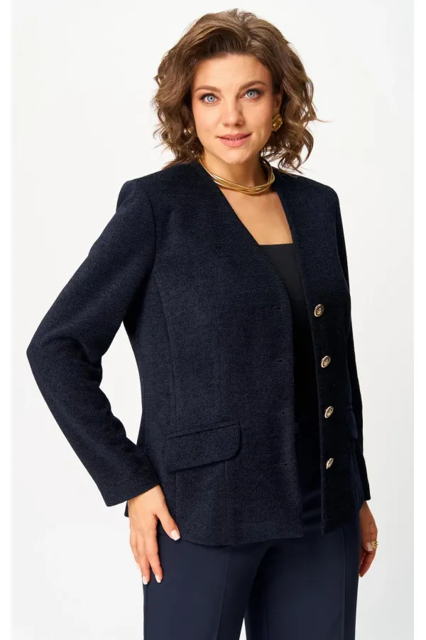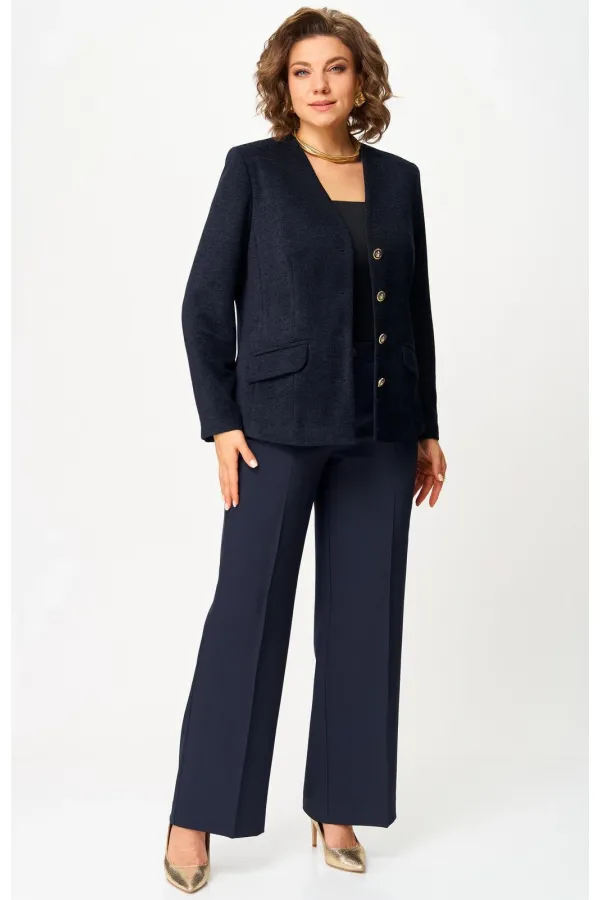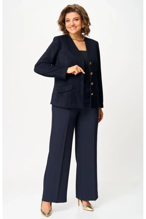 Костюм-двойка, Этот комплект — основа безупречного гардероба. Глубокий синий цвет и благородная фактура материала создают образ уверенной и стильной женщины. Жакет классического кроя, из премиального трикотажа, с центральной застежкой и V-образным вырезом, стройнит фигуру, зрительно вытягивает шею и создает элегантный силуэт, карманы функциональные с клапаном. Рукав полноценной длины. Длина жакета по спинке 62 см, длина рукава 61 см. Брюки широкого кроя, ткань текстиль, скрывают возможные несовершенства и дарят необычайную свободу движений. В сочетании с плотным трикотажем они создают струящийся, пластичный образ. Длина брюк по боковому шву 103 см.