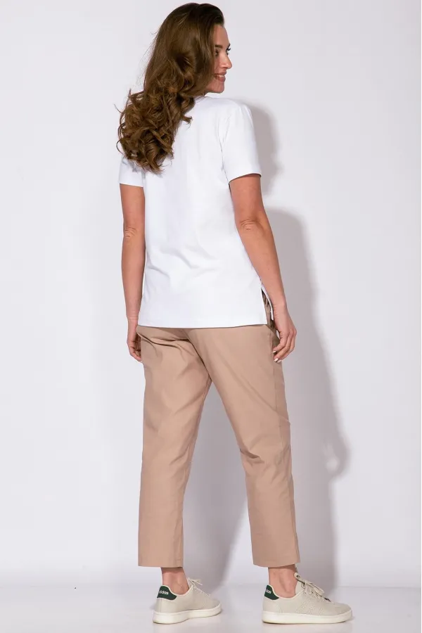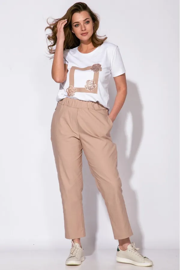 Комплект женский трехпредметный, состоит из ветровки, майки и брюк. Ветровка свободного силуэта,выполнена из хлопковой ткани без полкладки с накладными карманами на полочке и кулиской на талии. Рукав втачной с притачным манжетом на резинке по низу. Застежка молния. Длина куртки по спинке 80 см. Майка полуприлегающего силуэта, выполнена из вискозы. По центру притачная аппликация. В боковых швах разрезы. Брюки полуприлегающего силуэта с высокой посадкой, выполнены из хлопковой ткани, пояс на резинке. В боковых швах карманы с листочкой. Длина брюк 100 см.