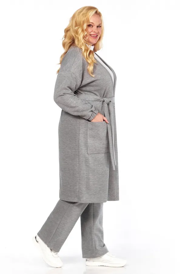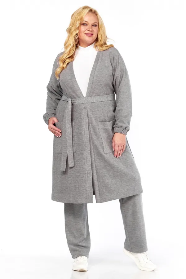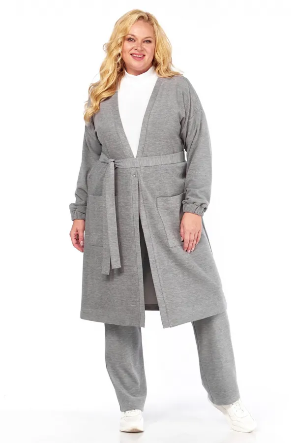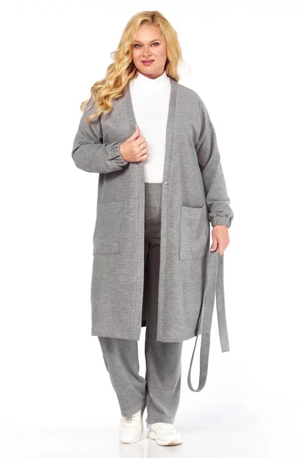 Костюм женский 2-ух предметный. Кардиган длинный ниже колена , на полочке накладные карманы , рукав спущенный с притачным манжетом. Застежка на 1 петлю и пуговицу. Брюки с карманами в боковом шве, пояс на резинке.