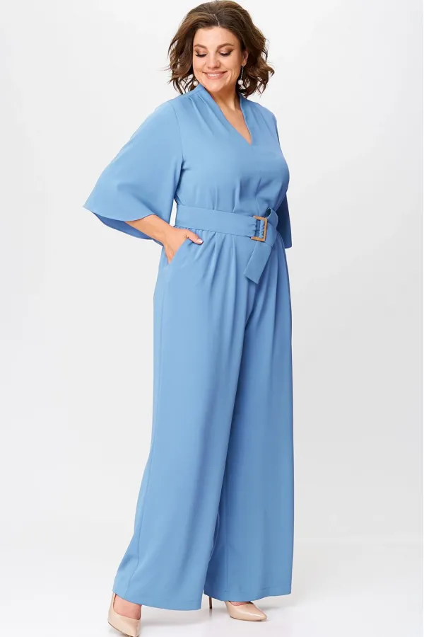 Комбинезон отрезной по линии талии, по лифу и брюкам заложены складки. Горловина «V» образная, застежка на тесьму-молния в среднем шве спинки.