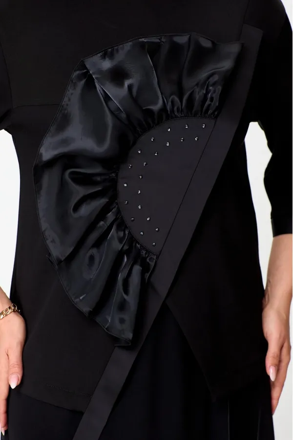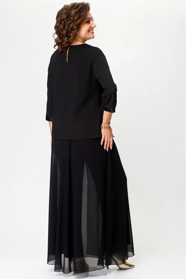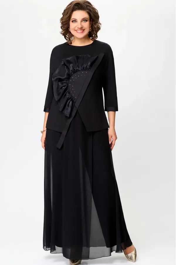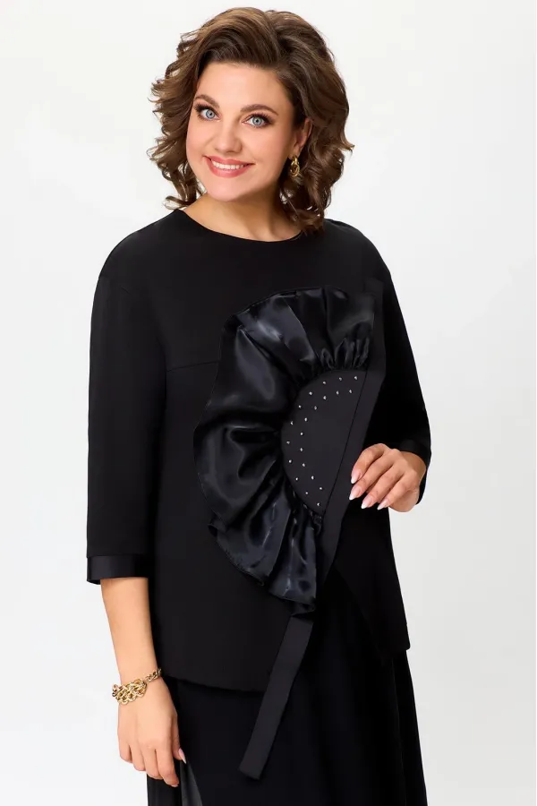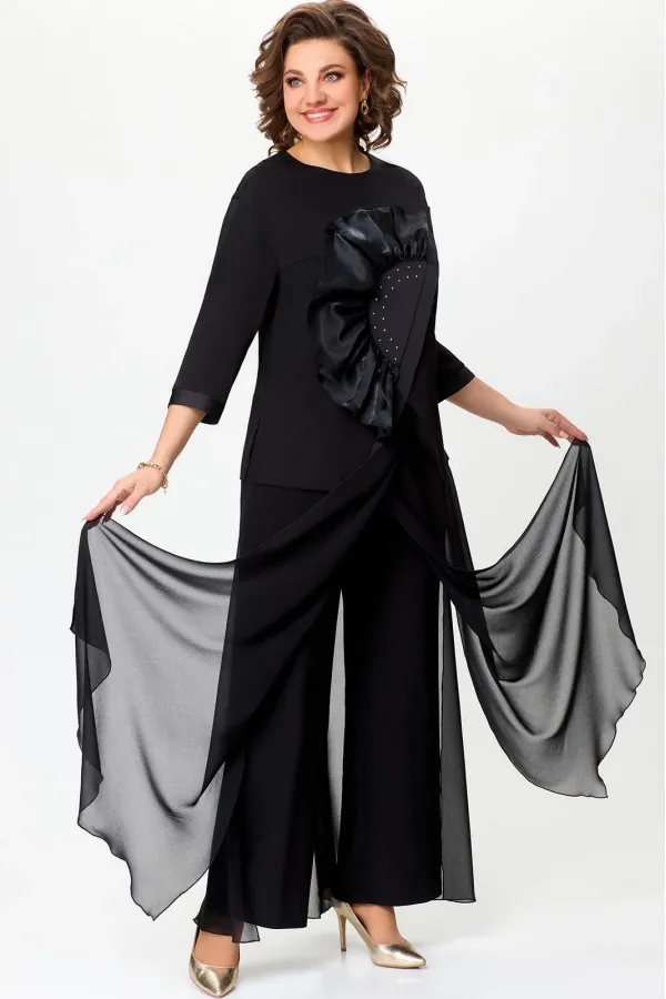 Костюм женский 2-х предметный, состоящий из блузы и юбки-брюк. Блузка полуприлегающего силуэта с заниженной линией плеча без воротника. По переду ассиметричный рельеф с планкой из отделочной ткани. По центру переда расположен декоративный цветок из отделочной ткани, украшенный стразами. В боковых швах обработаны разрезы. По спинке-центральный шов с разрезами в верху и застёжкой на петлю и пуговицу. Рукав прямой, длинной ¾ с бейкой по низу из отделочной ткани. Брюки широкие, прямого силуэта, без карманов, пояс на резинке. По верх брюк из шифона в пояс в точена юбка с запахом спереди и разрезами сзади и по бокам
