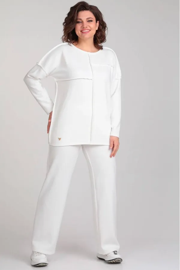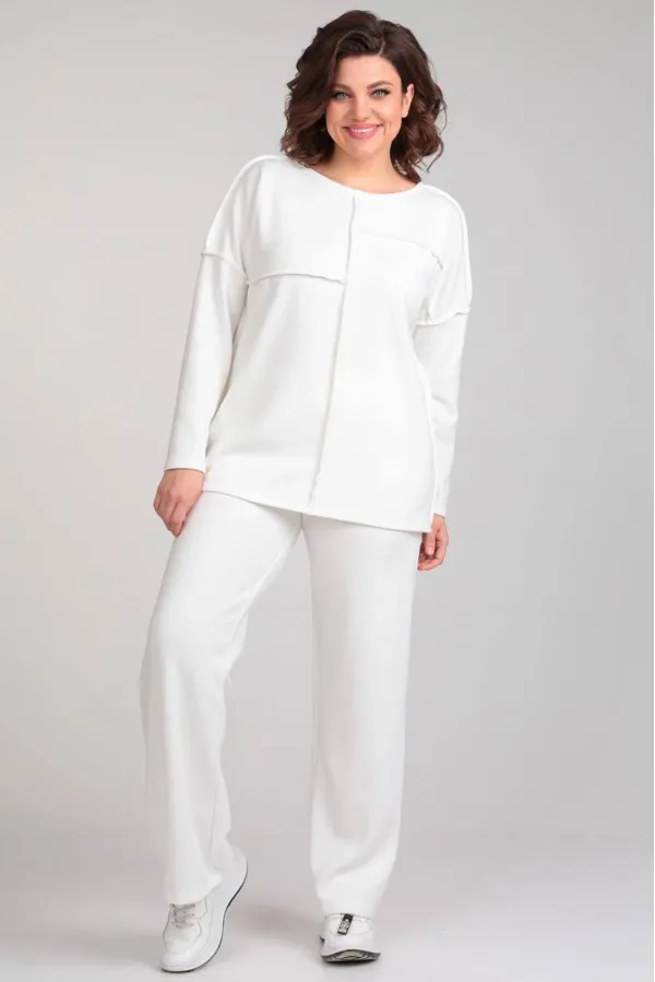 Комплект брючный : джемпер и брюки из трикотажного полотна. Джемпер с разрезными на 4 части передом и спинкой,швы обработаны припусками на лицо. Горловина округллой формы обработана распошивочным швом. Низ рукава и изделия тоже обработаны распошивочным швом. Брюки прямые. Цельнокроенный пояс на резинке.