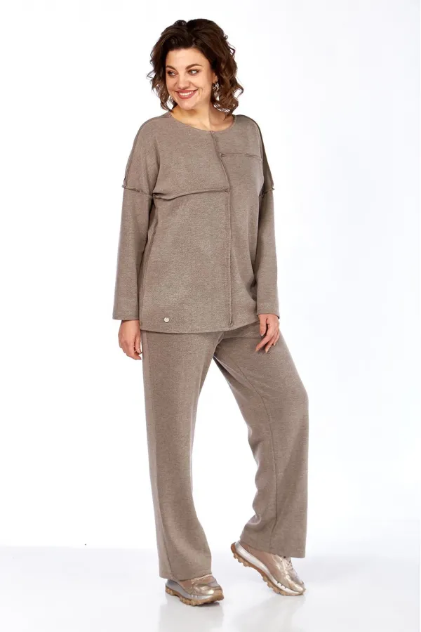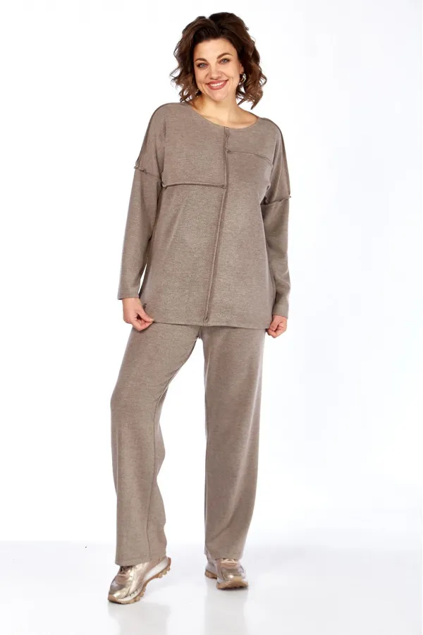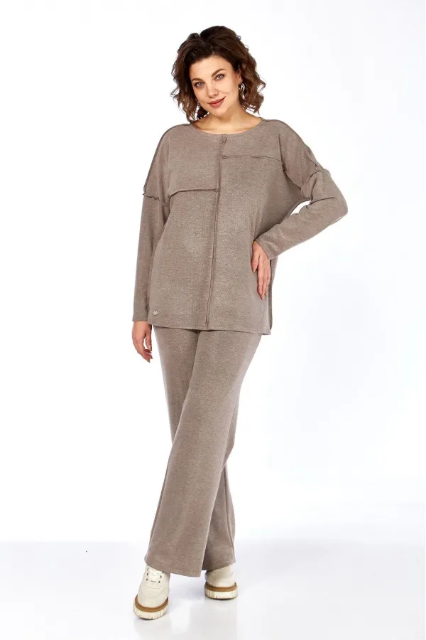 Комплект брючный : джемпер и брюки из трикотажного полотна. Джемпер с разрезными на 4 части передом и спинкой,швы обработаны припусками на лицо. Горловина округллой формы обработана распошивочным швом. Низ рукава и изделия тоже обработаны распошивочным швом. Брюки прямые. Цельнокроенный пояс на резинке.