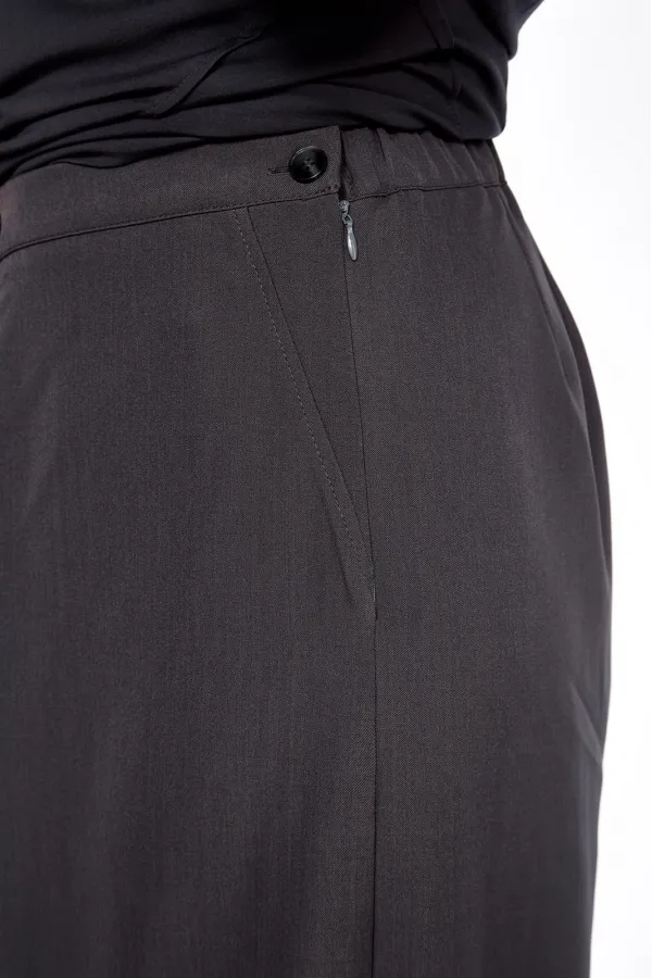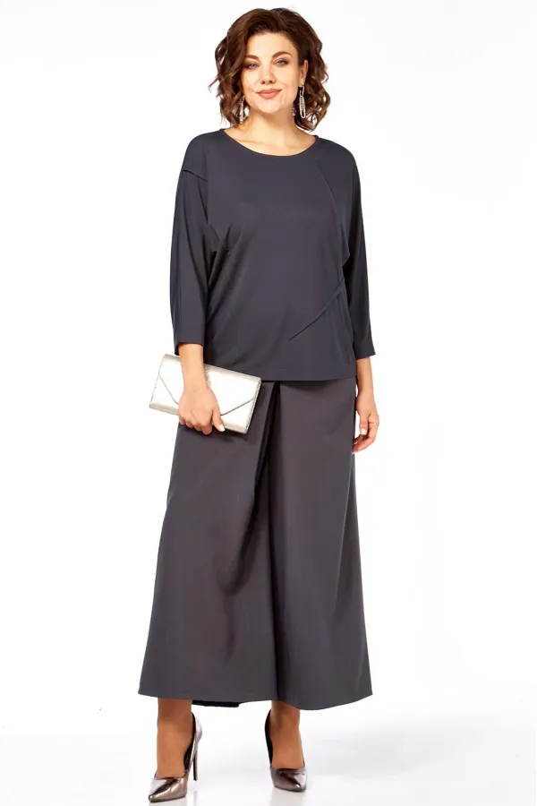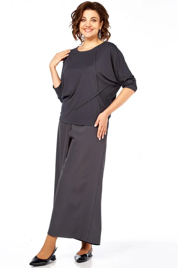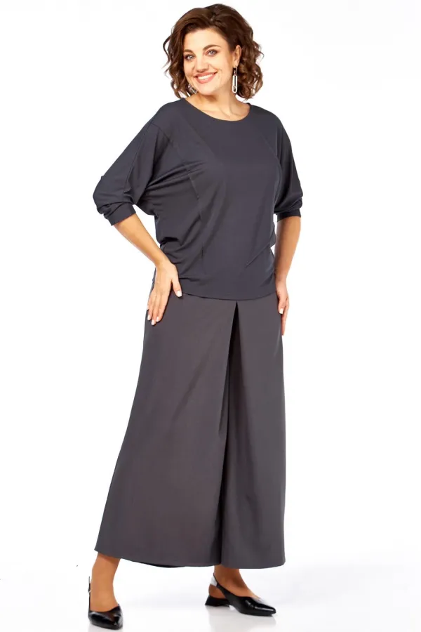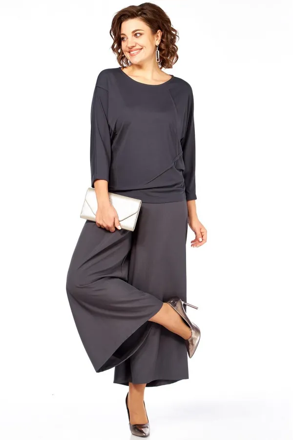 Комплект брючный состоит из кофты и кюлотов. Кофта выполнена из трикотажного полотна. Спинка со средним швом. Перед с ассиметричными застроченными наверх вытачками. Рукав цельнокройный, длиной 7/8. Горловина округлой формы. Брюки-кюлоты со встречной складкой спереди. По бокам имитация карманов. В левом боковом шве потайная молния. Пояс притачной.