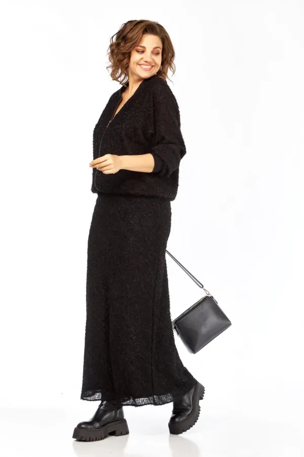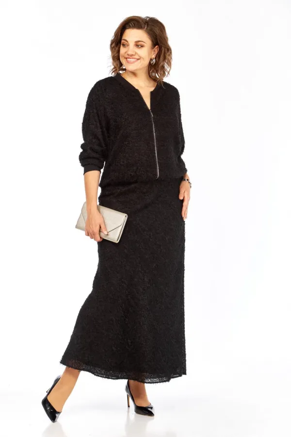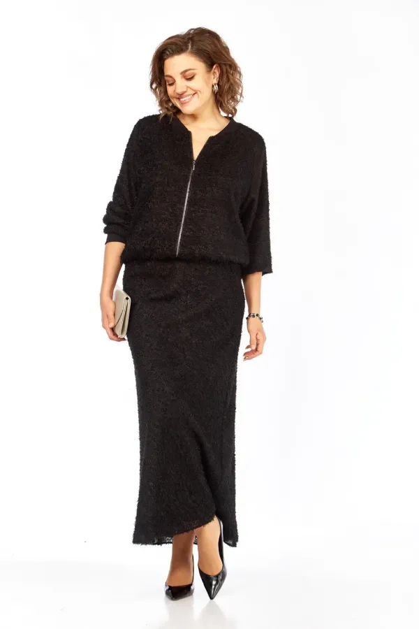 Костюм женский с юбкой. Кофта с центральной застежкой на тесьму-молнию, рукава-реглан. По низу изделия и низу рукава - манжет из отделочной ткани. По горловине воротник-стойка из отделочной ткани. Кофта на подкладке. Юбка длинная, верхний рсез обработан поясом с резинкой сзади. Застежка в левом боковом шве на тесьму молнию, петлю-пуговицу. Юбка на подкладке.
