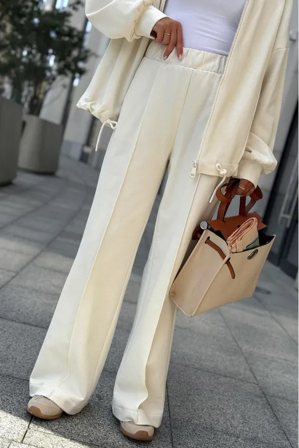 Брюки прямые, на притачном поясе с резинкой. Задние половинки брюк без конструктивных особенностей. По передним половинкам брюк обработаны косые боковые карманы и по середине передней половинки застрочены защипы.