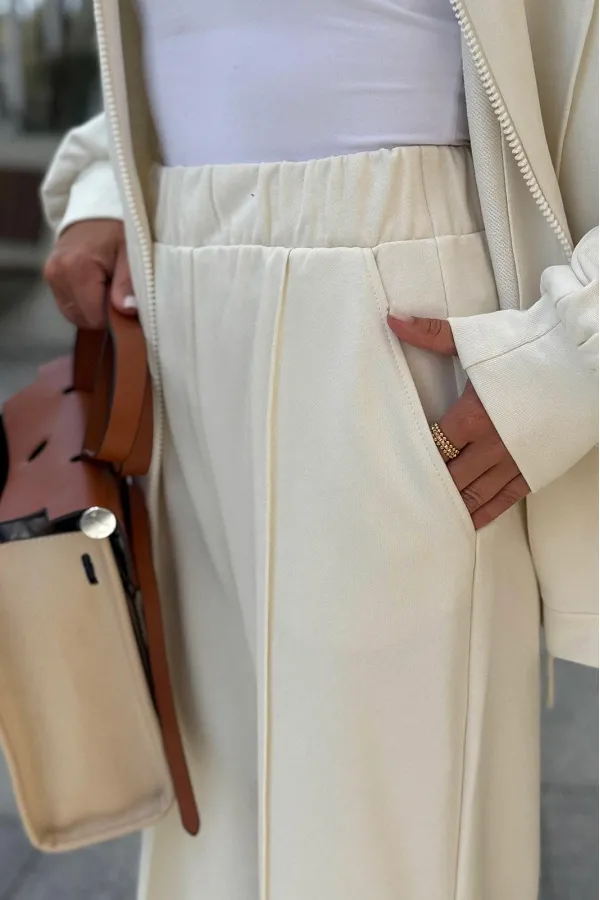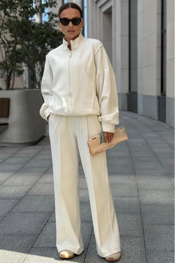 Костюм женский, спортивный, состоящий из брюк и джемпера.Брюки прямые, на притачном поясе с резинкой. Задние половинки брюк без конструктивных особенностей. По передним половинкам брюк обработаны косые боковые карманы и ... Читать далее...