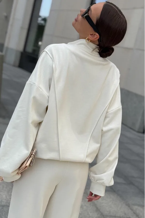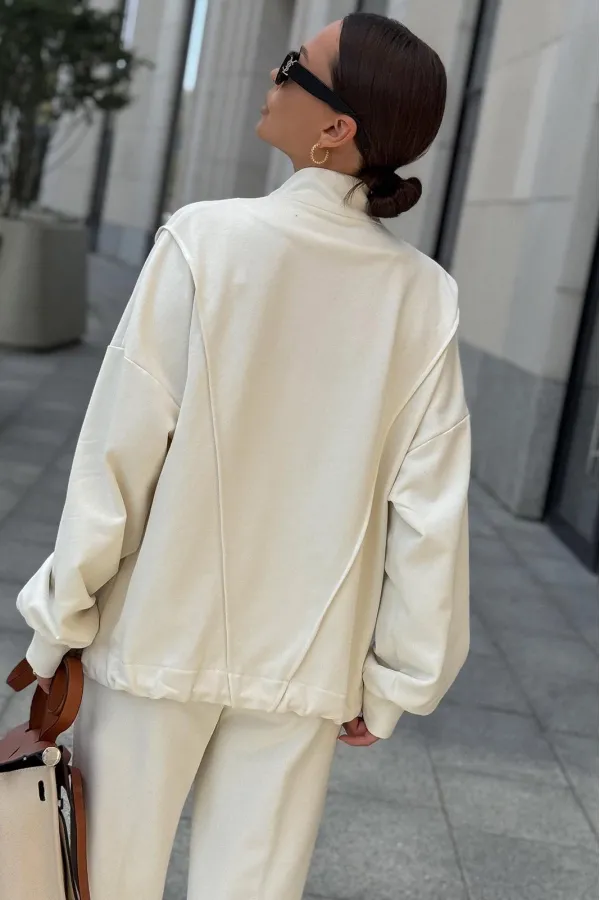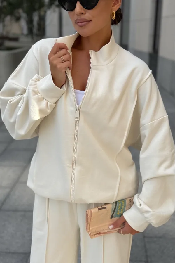 Джемпер с застежкой на тесьму молнию по центру изделия . По низу переда пробиты люверсы, в которые протянут шнурок. Рукава одно шовные, низ рукава со сборкой и притачной манжетой. Воротник стойка.