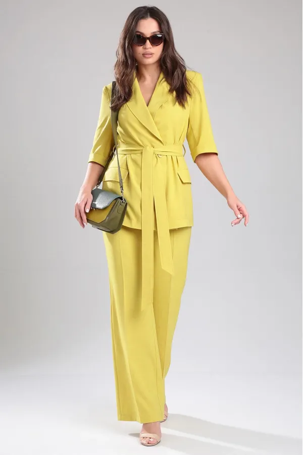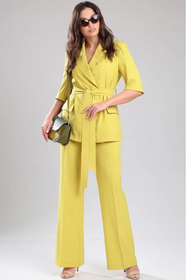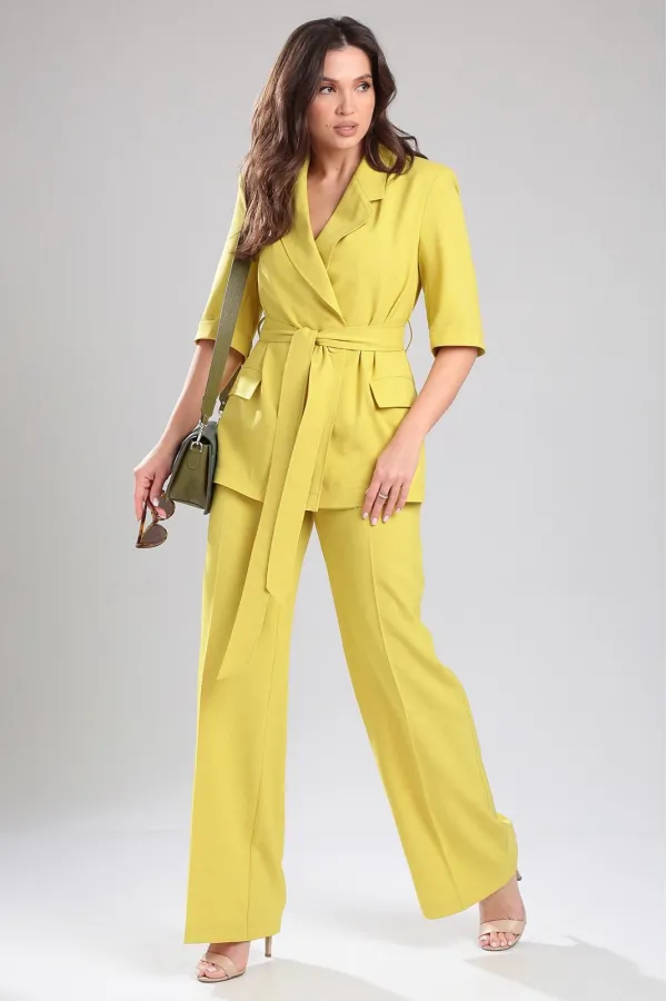 Летний брючный комплект из облегченной костюмной ткани “Лён-Вишер”. Жакет двубортный с застежкой на петли, пуговицы, под пояс (пояс в комплекте), рукав втачной, короткий, с отворотом, по полочкам прорезные карманы с клап... Читать далее...