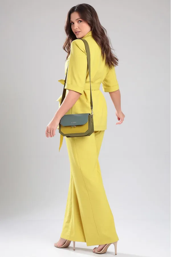 Жакет двубортный с застежкой на петли, пуговицы, под пояс (пояс в комплекте), рукав втачной, короткий, с отворотом, по полочкам прорезные карманы с клапаном и обтачкой.