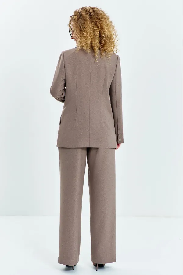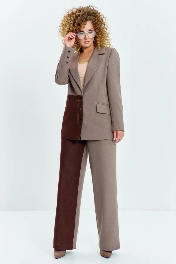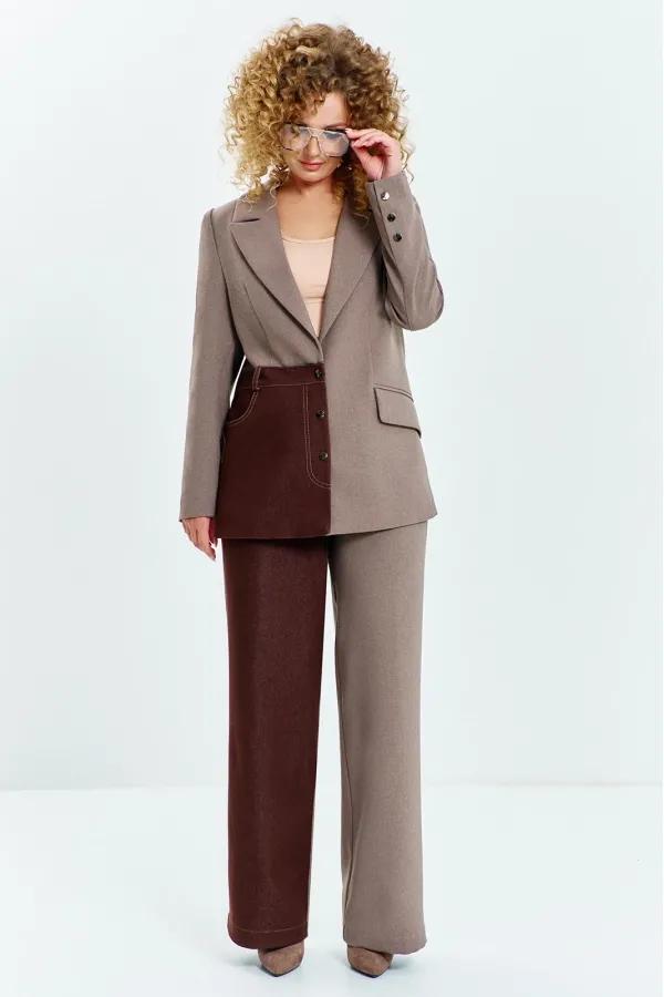 Костюм женский выполнен из сочетания костюмной ткани и джинса, состоит из жакета и брюк, жакет полуприлегающего кроя с имитацией на полочке - джинсы и функциональными карманами, воротник V-образный, отложной . Рукав длинный втачной. Жакет с полной подкладкой. Брюки завышенной посадки на притачном поясе с резинкой в боковых швах брюк расположены карманы, застежка молния на гульфике.