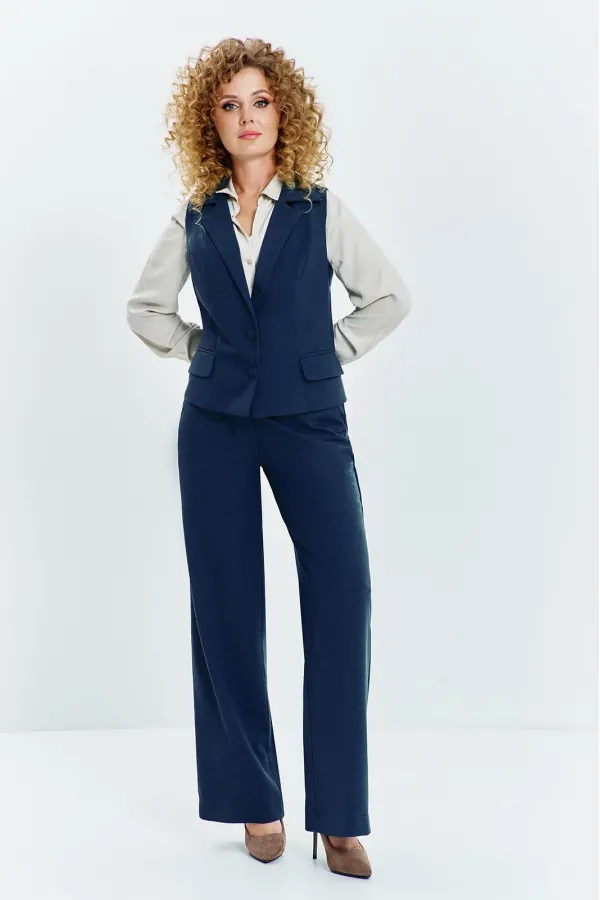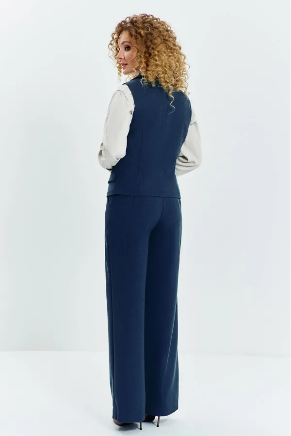 Костюм классический офисный состоит из жилета и брюк. Жилет приталенный классической формы. укороченный, по полочке жилета расположены рельефы и прорезные карманы с клапаном, воротник отложной с лацканами. Спинка жилета с талиевыми выточками. Жилет с подкладом. Брюки средней посадки, классического кроя на притачном поясе с резинкой. В боковых швах имеются карманы, застежка молния на гульфике.