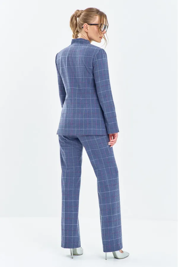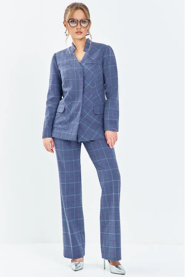 Костюм женский 2-х предметный состоит из жакета и брюк, Жакет полуприлегающего силуэта выполнен из костюмной ткани, по полочке жакета расположена накладная деталь с функциональным прорезным карманом рамка, и декоративные фальш-карманы в области груди. Рукав втачной длинный. горловина обработана плоско лежащим воротником -стойкой. Застежка жакета - потайная (супатная) на петли-пуговицы. Жакет на полной подкладке.Брюки классического кроя, прямые от бедра, с высокой посадкой. Пояс в брюках втачной с резинкой, застежка молния на гульфике и петля - пуговица
