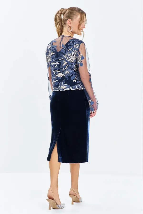 Комплект женский состоящий из платья и блузона. Платье женское выполнено из велюра полуприлегающего силуэта, горловина V-образная, платье без рукава на широких бретелях. На спинке платья находятся таллиевые выточки и потайная молния, по низу изделия расположен разрез. Блузон выполнен из сетки с вышивкой, горловина округлая, рукав втачной длинный расширенный к низу, на спинке расположена петля с застежкой.